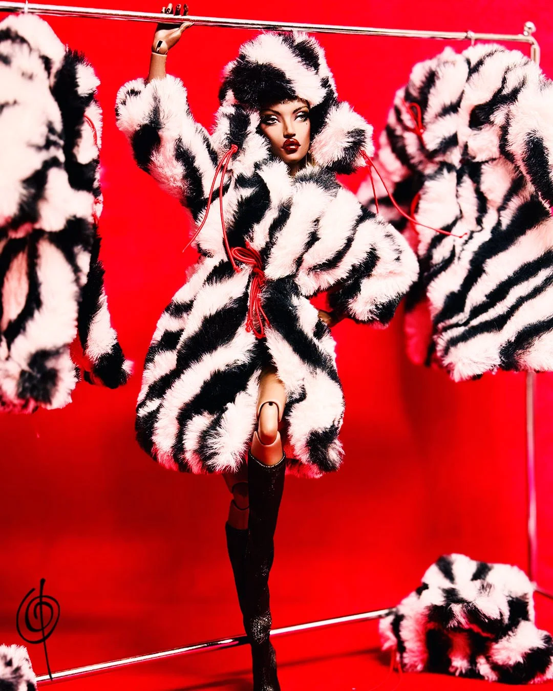 Chaos debuts its first winter fashion release; TRAP! - a couture fur set built for the bold. Handcrafted from ultra-soft faux fur in distorted zebra, each coat is fully lined in blush silk taffeta and paired with a matching trapper hat. The look is pulled together with vivid red elastic ties belted at the waist.